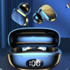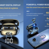 This device features an LED display, noise reduction, fast BT wireless connection, IPX6 waterproof, ergonomic design, long battery life, and comes with a charging box and cable for convenience.